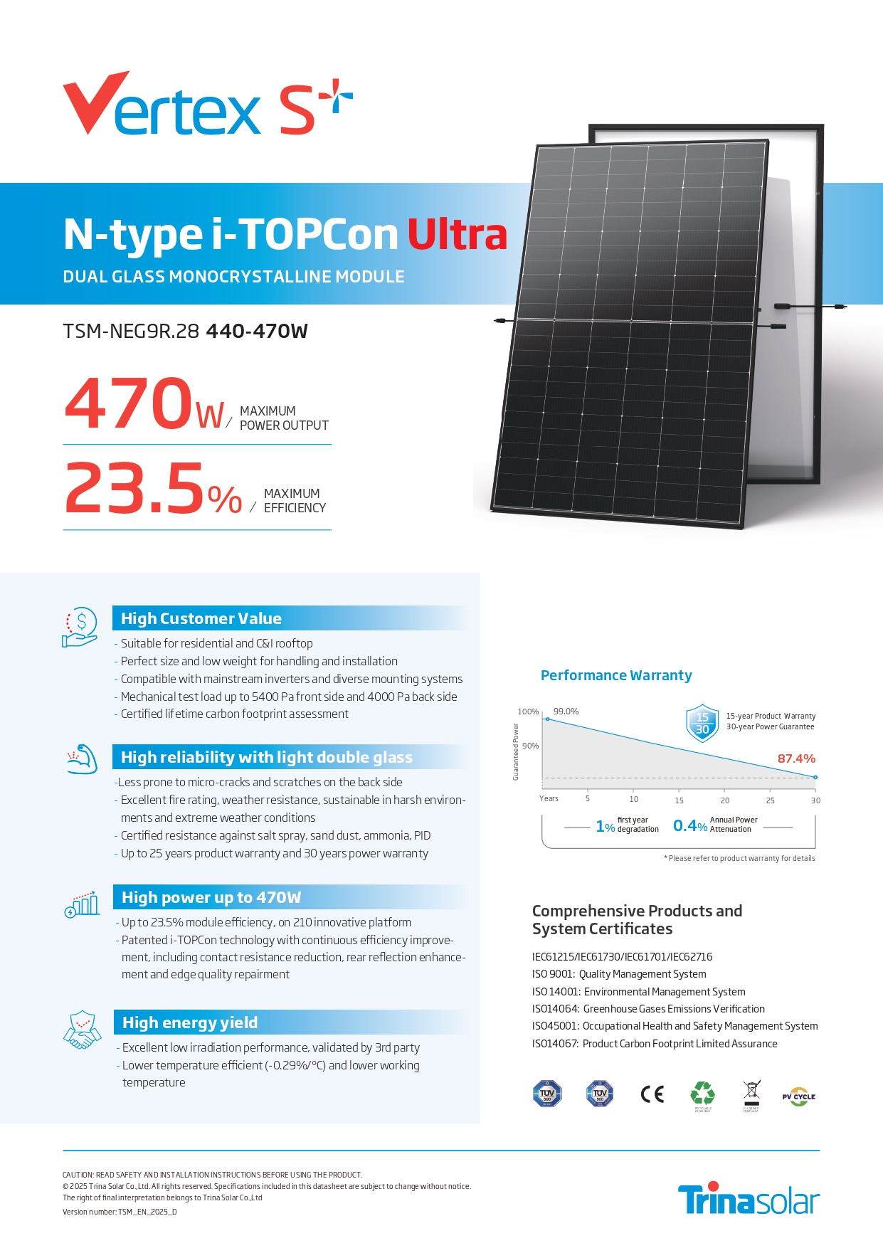 - Branchenführende Garantien: Trina Solar bietet 15 Jahre Produktgarantie und unglaubliche 30 Jahre lineare Leistungsgarantie (garantierte 87,4 % Leistung nach 30 Jahren).